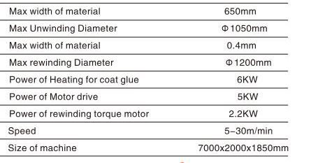 PUR700 Model non-woven and aluminum membrane laminating machine consist of coating machine, winding machine Mainly is suitable for laminating coiled material Machine production is coating a layer of PUR hot melt adhesive by the anilox roller on non-woven lining from the first roll, then aluminum membrane from second roll